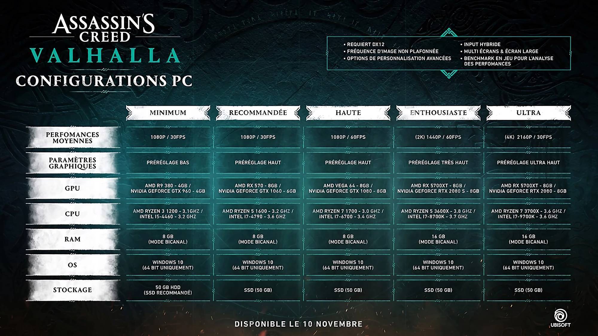 Pour ce qui est du poids du jeu, ce dernier prendra 50GB d’espace sur votre disque, avec une installation recommandée sur SSD. Au passage, le titre bénéficiera d’un patch Day One d’un poids d’environ 3 Go. Et pour finir, tout comme Odyssey, Assassin’s Creed Valhalla disposera d’un benchmark afin d’analyser les performances de votre PC.