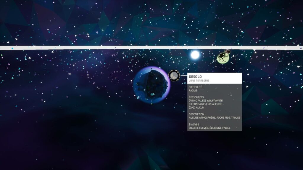 C’est parti direction Desolo, la lune de Sylva (notre planète de départ). Desolo est une lune à la difficulté facile, où l’énergie solaire est élevée mais pas l’éolien, qui est faible. L’intérêt de cette lune est qu’elle abrite du Wolframite, qui se raffine en… Tungstène ! Notons aussi la présence de Shalérite (Zinc).