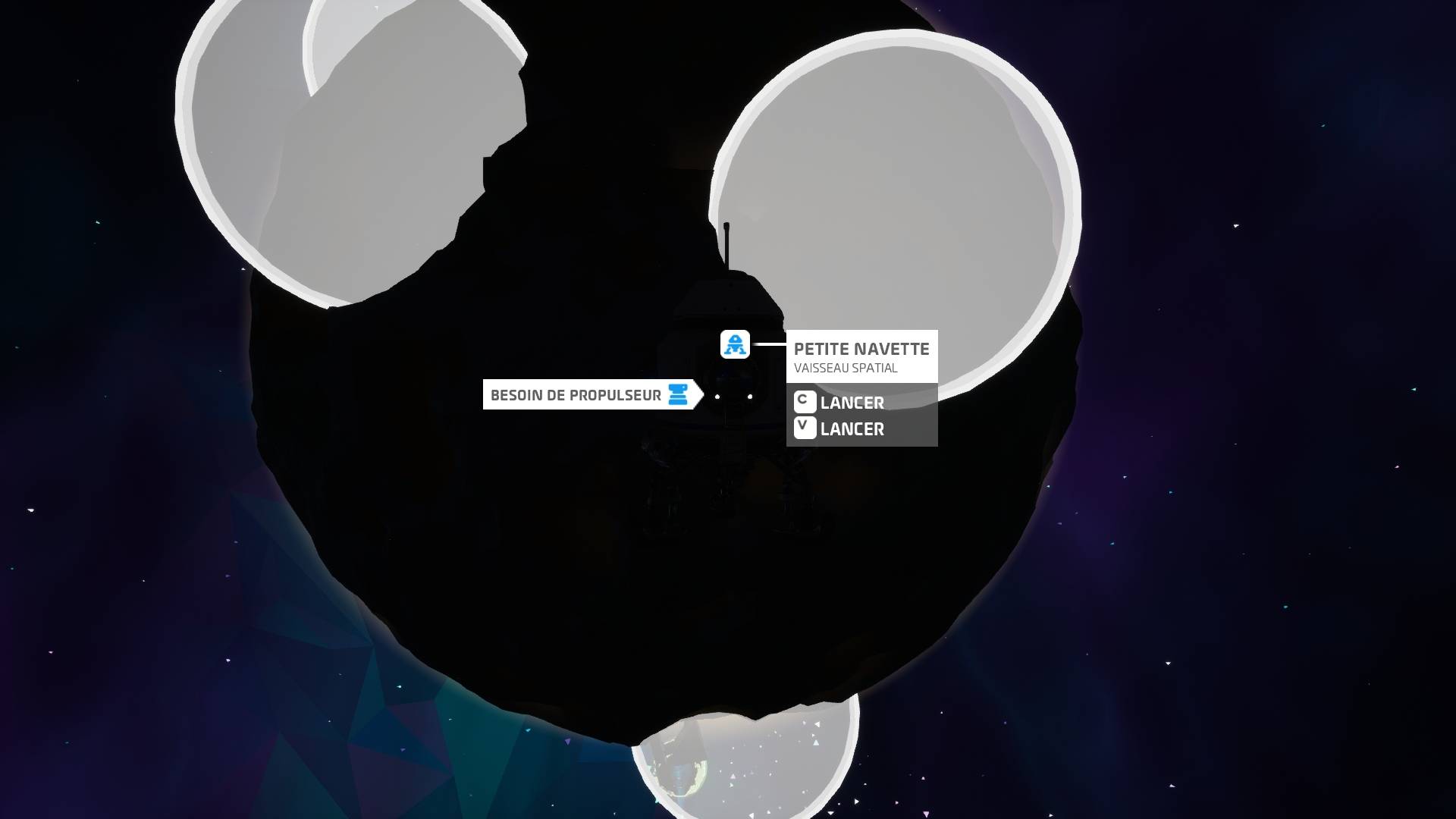 Ma première zone d’atterrissage ne convenant pas à mes attentes, j’ai re-décollé pour me poser un peu plus loin… grossière erreur ! Une fois atterri sur cette nouvelle zone, je me suis rendu compte que mon propulseur était tout cassé !