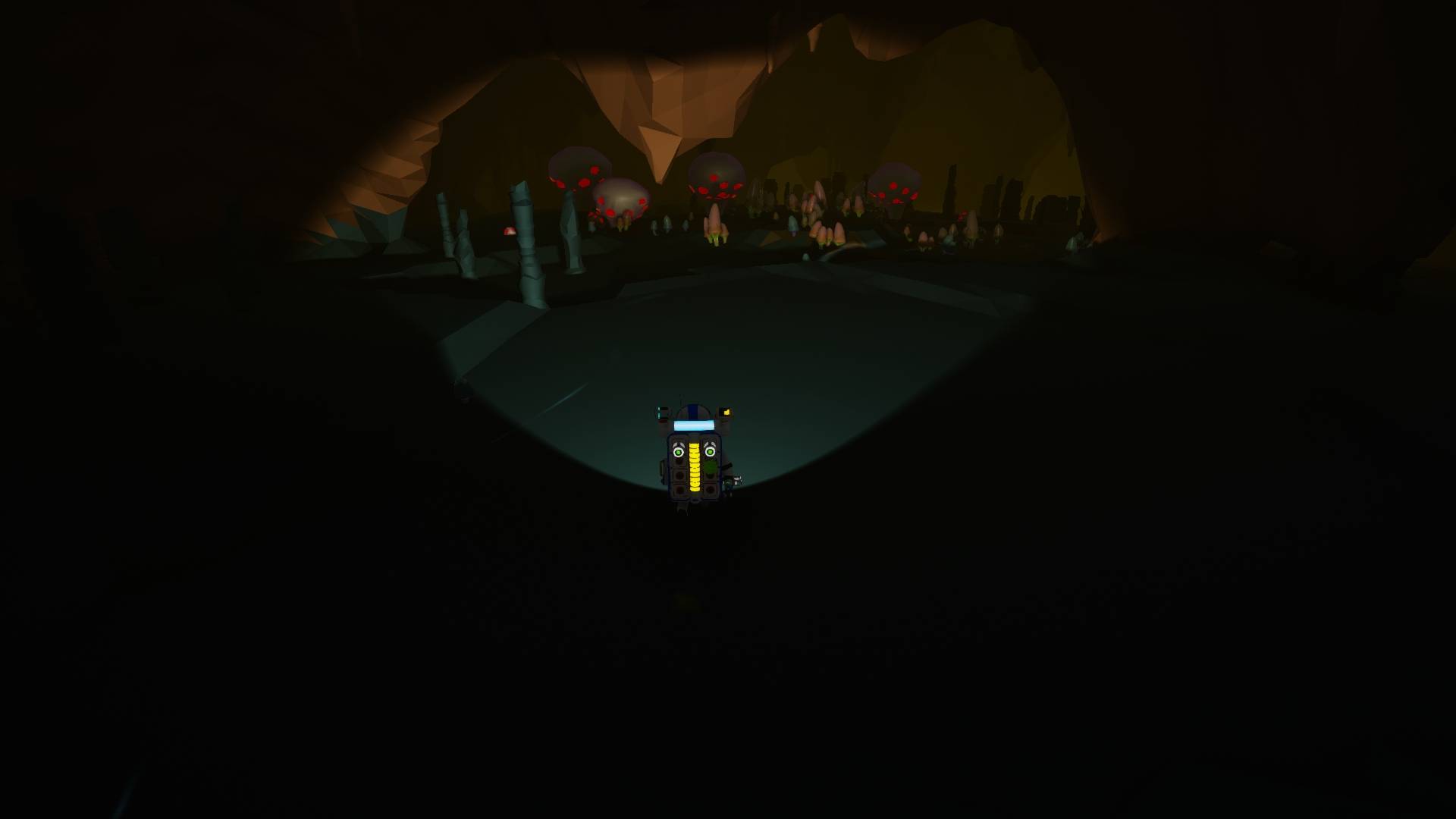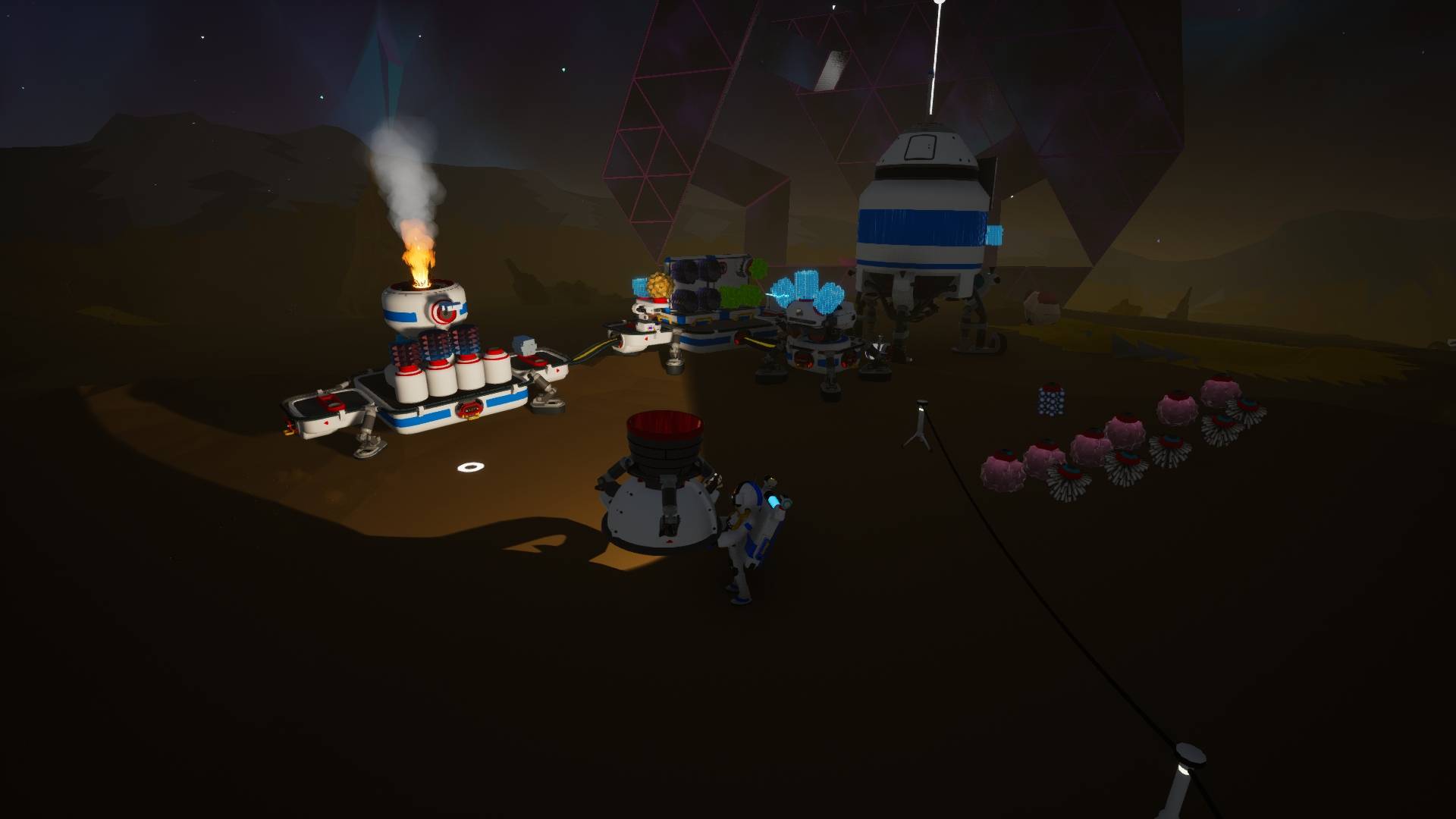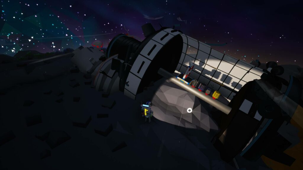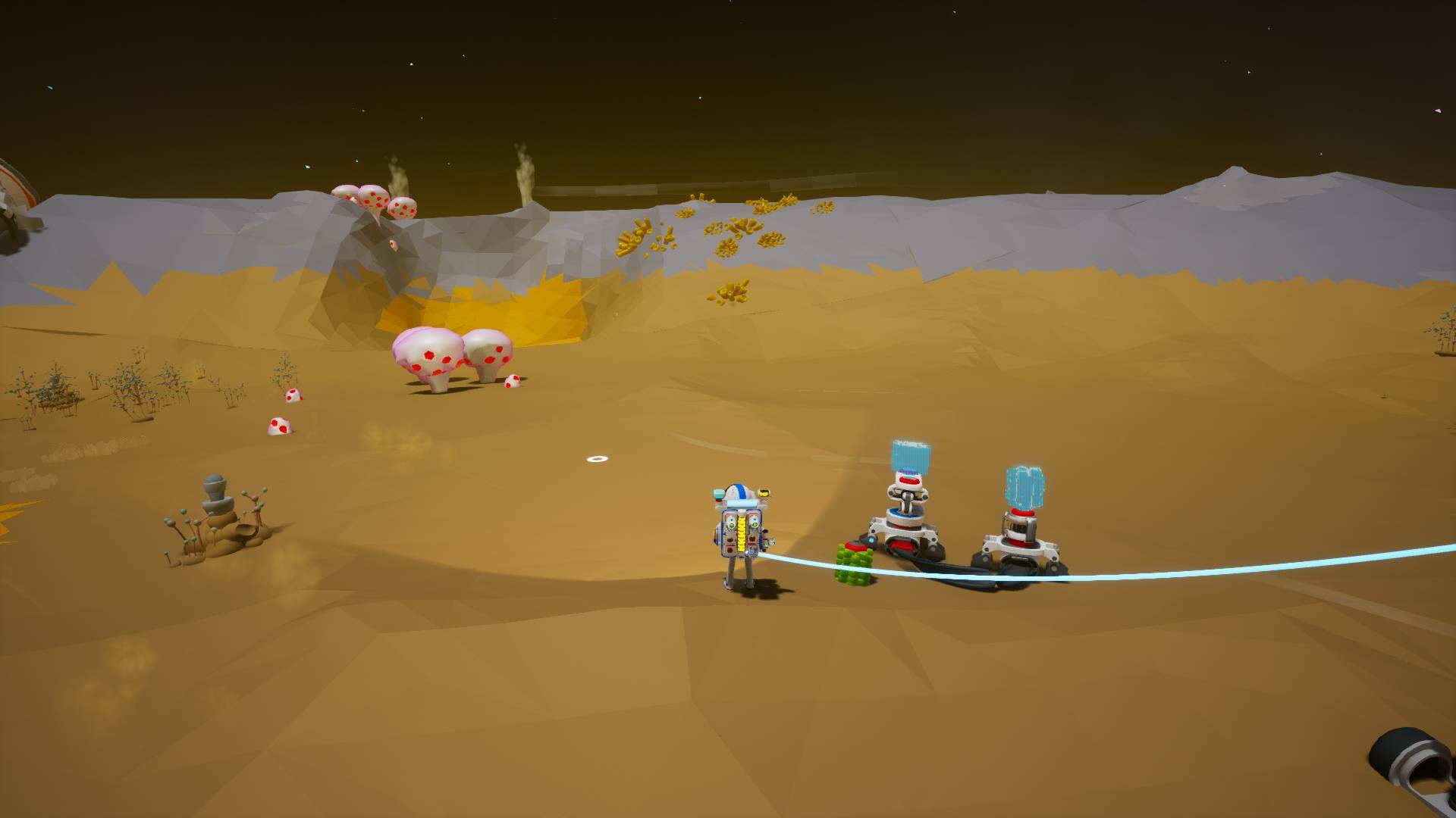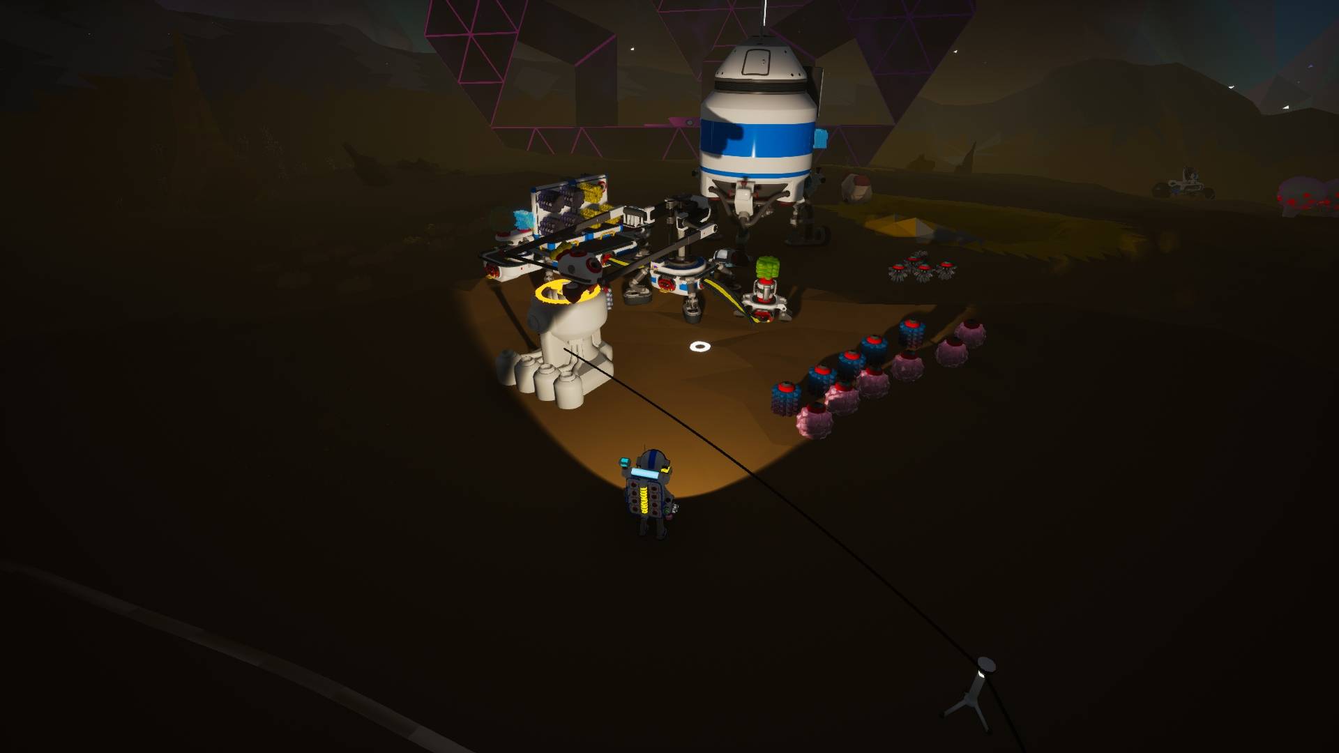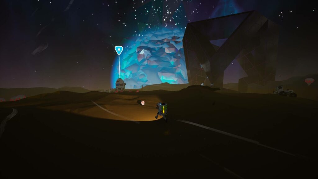 Mais le temps est venu de découvrir ce que renferme ces structures. Je me suis donc mis en route vers celle la plus proche de la base ! Elles sont relativement faciles à repérer grâce à leur faisceau lumineux pointé vers le ciel.