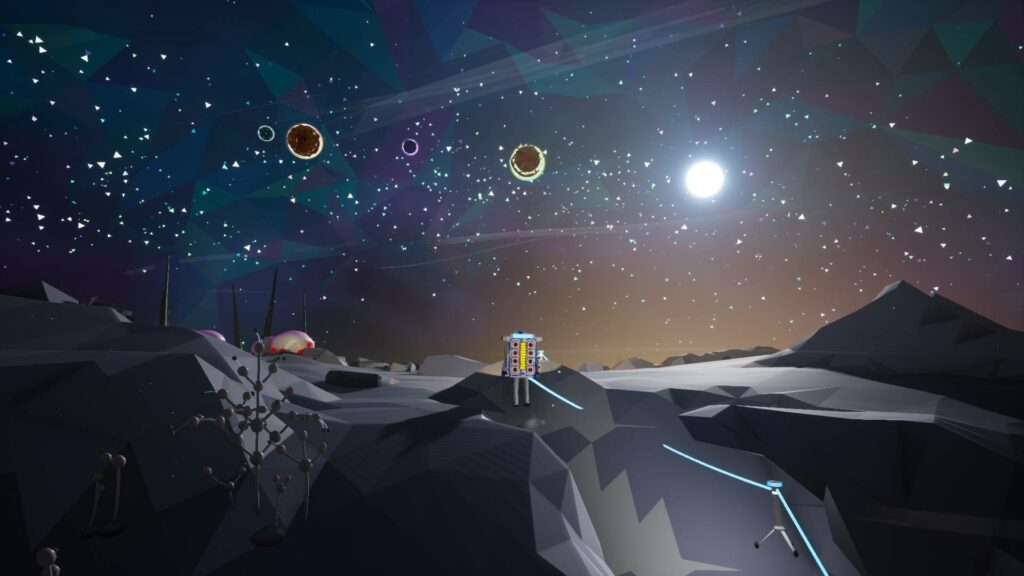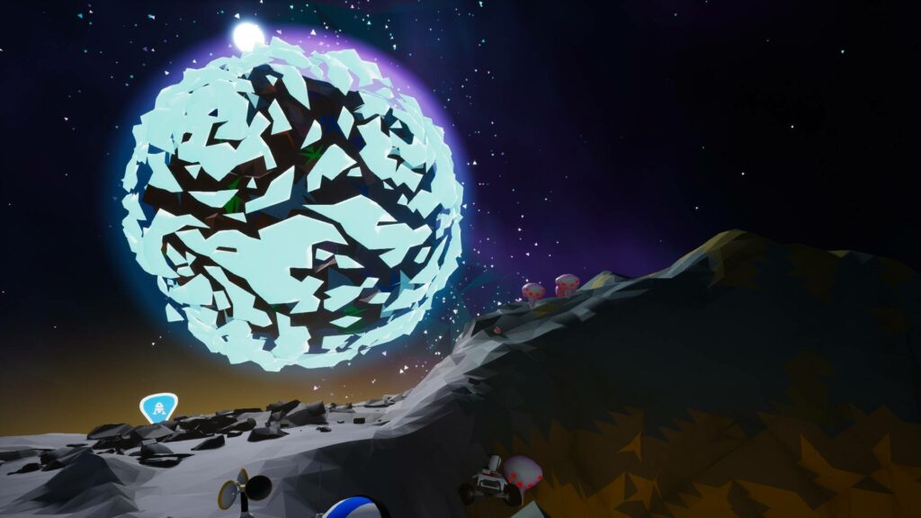 N’ayant pas d’atmosphère, la vue sur l’espace est quant à elle vraiment magnifique. Avec ce ballet de planètes volant dans le ciel. D’ailleurs, vu la taille réduite de la lune, le cycle jour/nuit est très rapide.