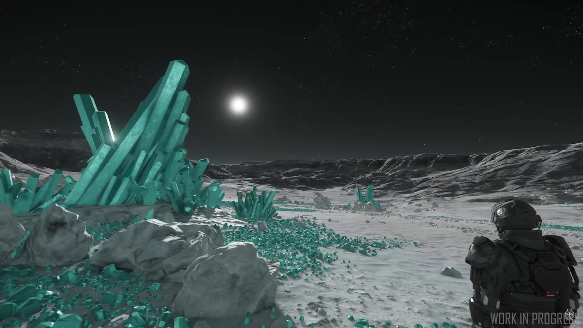 Nous partons ensuite sur un concept art de Wala, une des lunes d’ArcCorp, dont les formations cristallines demanderont d’ajouter des fonctionnalités au système de minage pour pouvoir les récupérer.