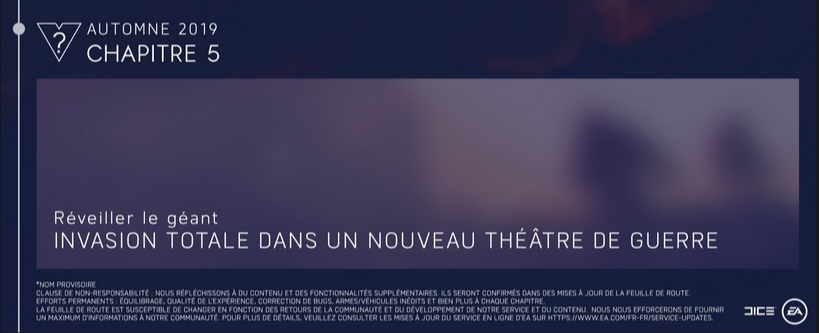 Ce chapitre 5 commencera au début de l’automne 2019, ce dernier s’intitule « Réveiller le géant » pour le moment aucune information n’a été dévoilé concernant son contenu, peut-être un front russe, ou encore l’invasion américaine avec le débarquement qui sait !? Nous en reparlerons en temps voulu, quand nous disposerons de plus d’informations concrète.