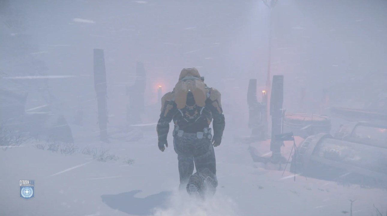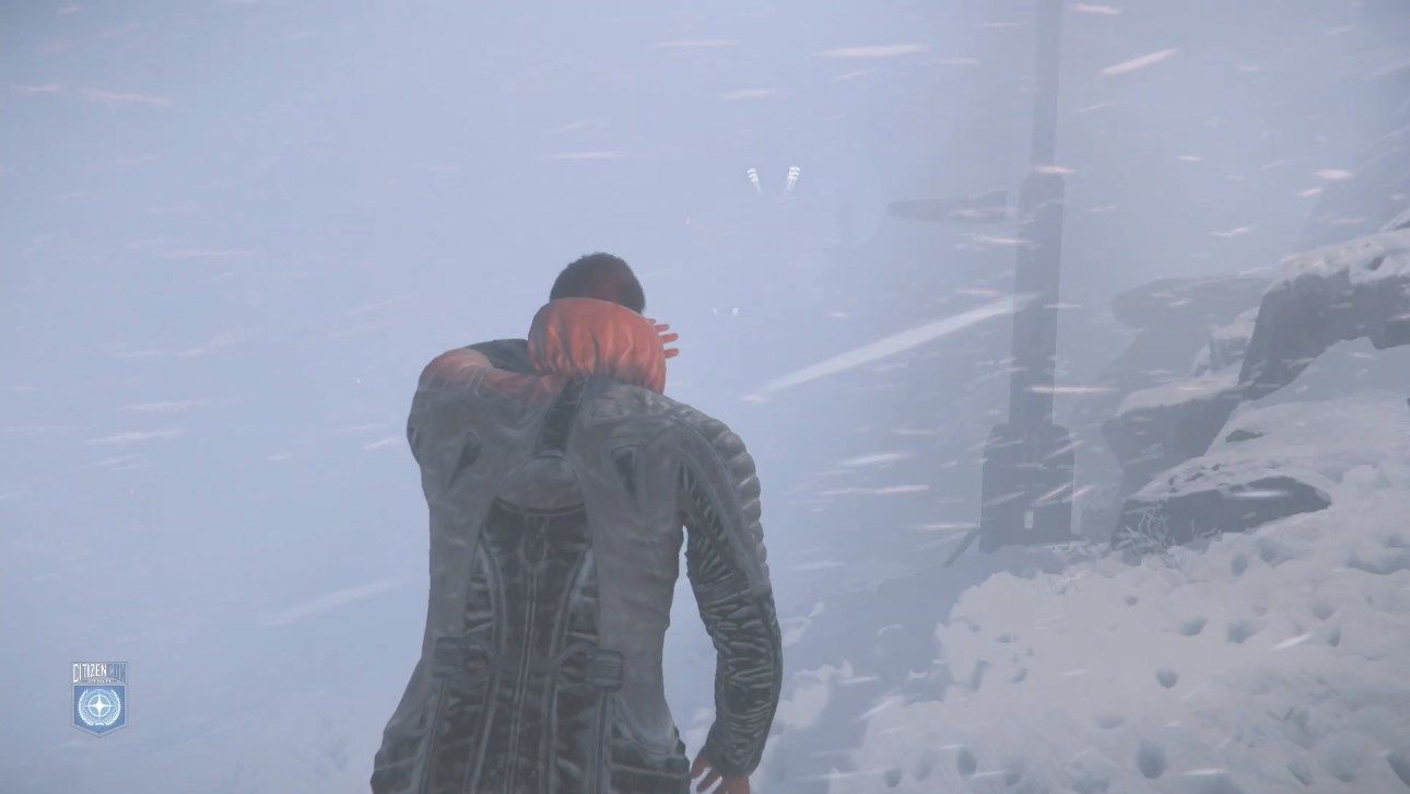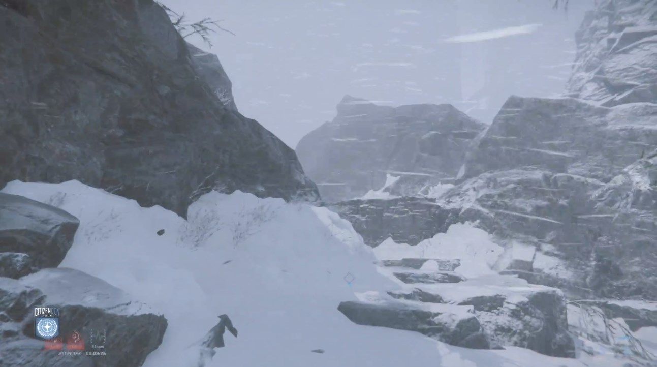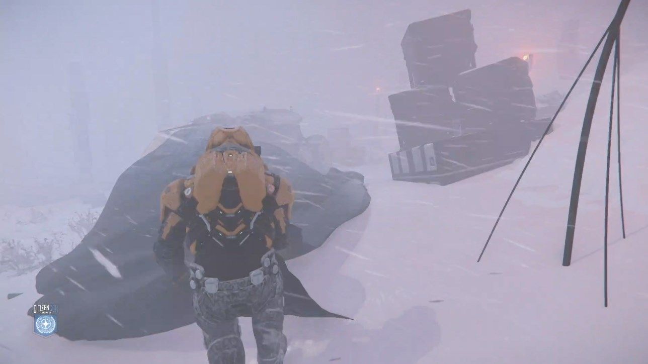 Après avoir rejoint l’extérieur du bâtiment, où la tempête de neige fait rage, nous nous dirigeons vers une caverne contenant miraculeusement une armure prévue pour résister aux froids extrêmes. Un rover RSI Ursa nous attend un peu plus loin, caché sous une bâche, avec une physique de vêtement, qui tient on ne sait trop comment vu les vents puissants et l’absence d’accroche.