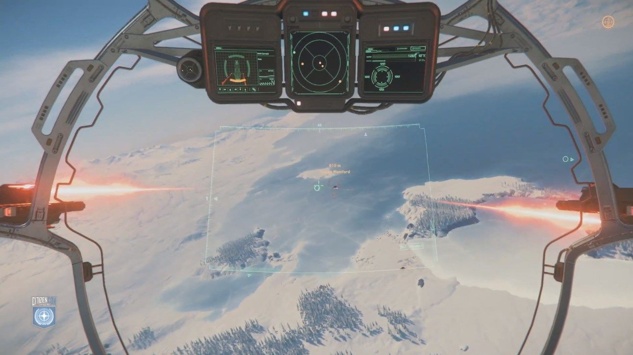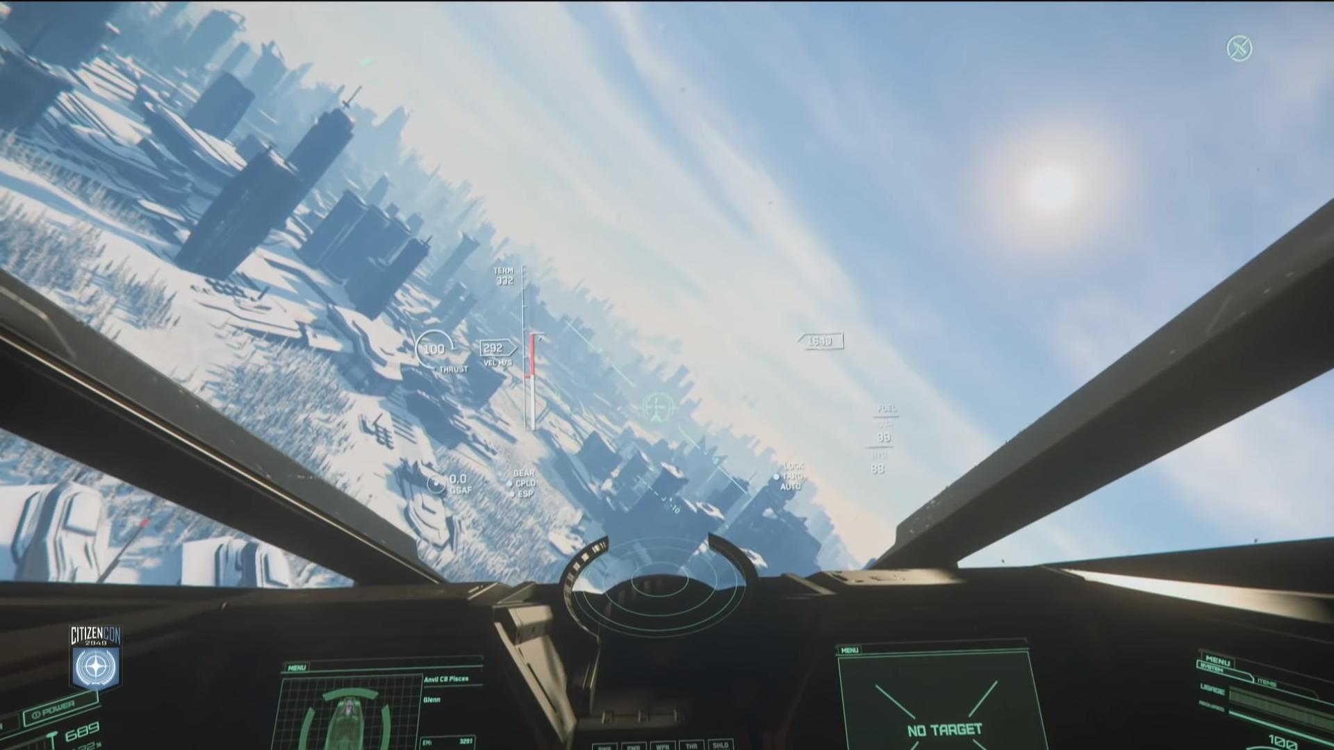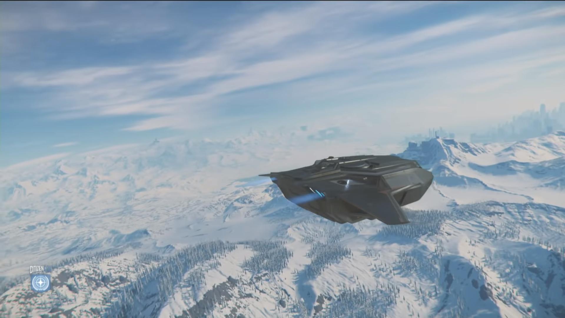 En vol, nous découvrons les paysages complètement gelés de microTech. C’est beau, mais on a été surpris par la pauvreté de certains éléments de décors comme les arbres, où le même asset à été utilisé pour la totalité de la forêt…