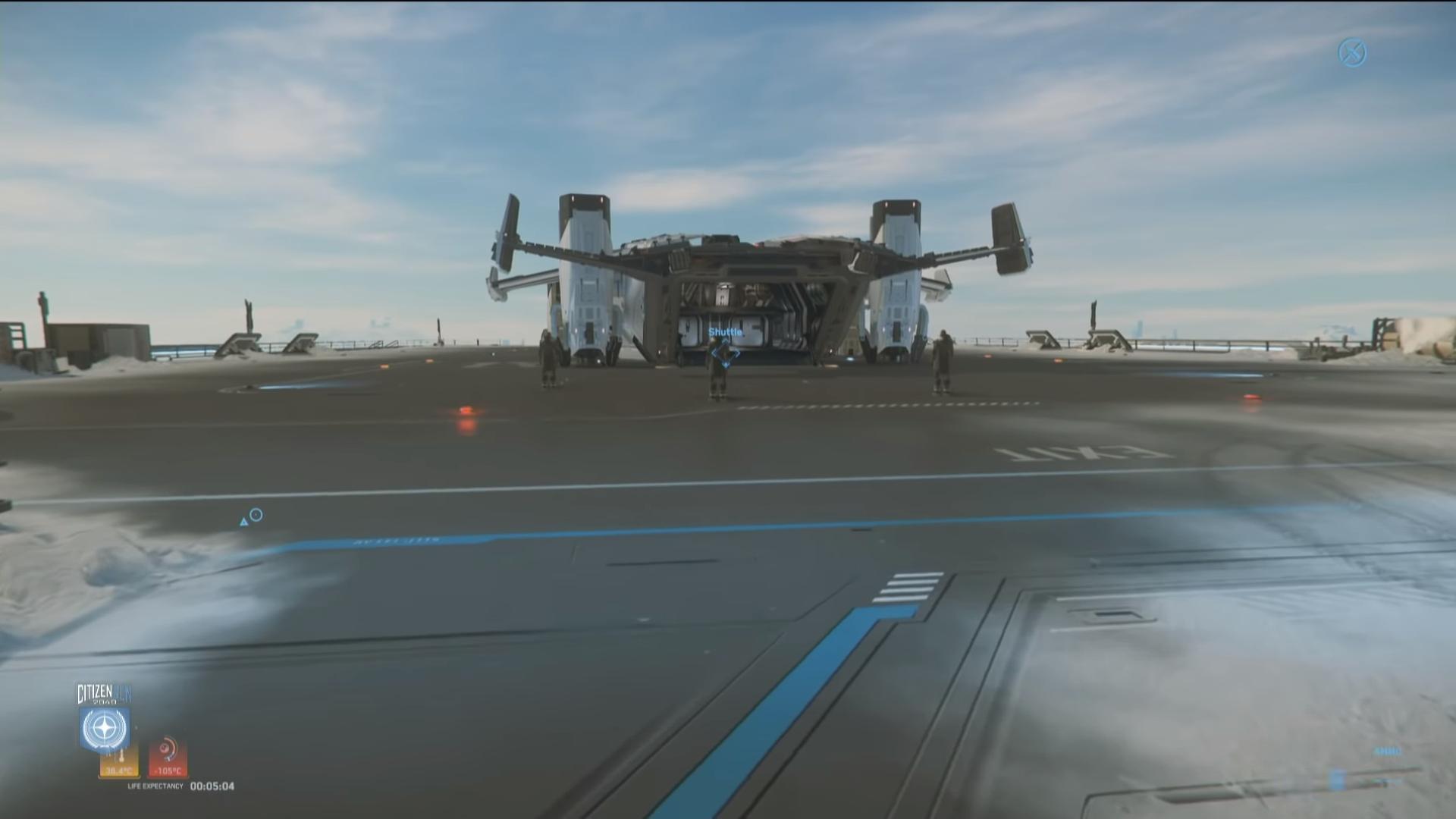 Nous partons ensuite vers la direction des vols commerciaux avec un scan d’identité qui nous amène vers un Valkyrie servant de navette. Le personnage réagit à la température extérieure par sa respiration et des tremblements dus au froid.