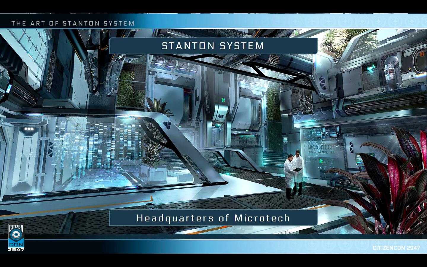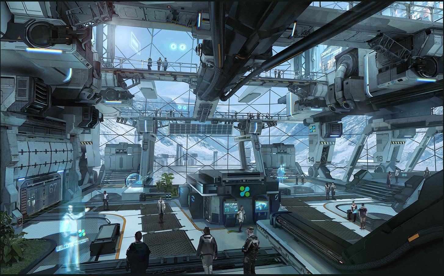 L’intérieur du Spatioport de New Babbage est très épuré, ce qui donne l’aspect d’une salle blanche d’un laboratoire. L’ambiance est clairement celle qui correspond à l’image de microTech, mais on a complètement perdu l’âme qui ressortait dans les artworks.