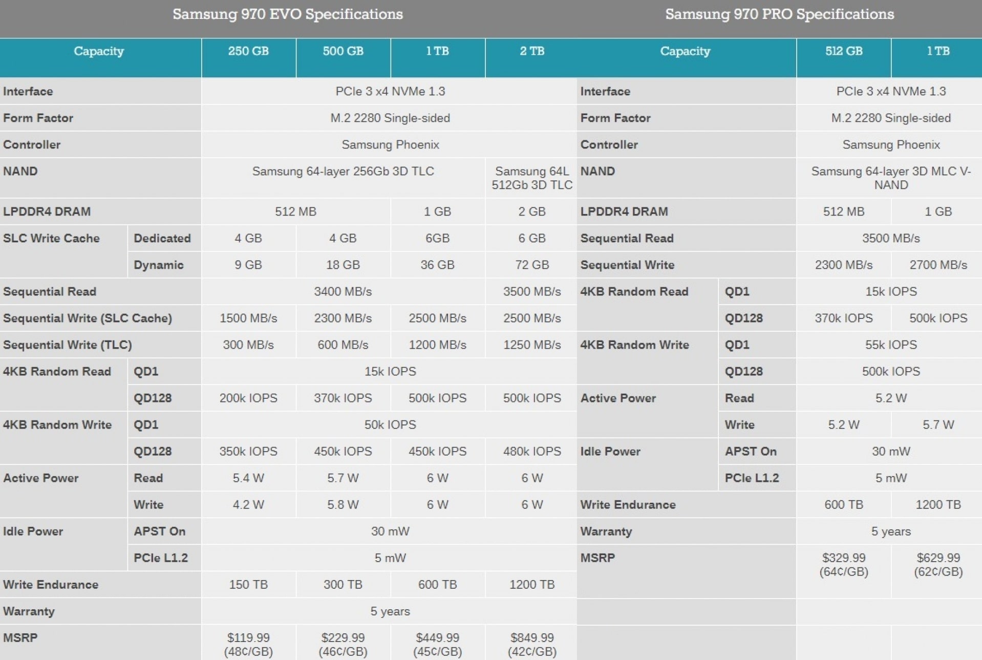 Le 970 Pro est disponible en 2 versions : 512 Go et 1 To, tandis que le 960 Pro atteignait 2 To.