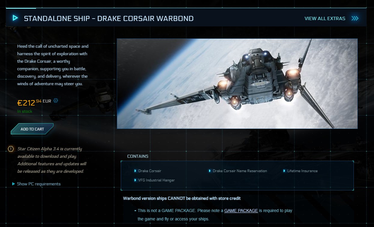 Disponible en version Warbond, c’est-à-dire en achat direct sans utilisation des « Store Credit » à 212.94€, le pack comprend le vaisseau et un hangar (VFG Industrial), une assurance LTI (à vie) ainsi que la possibilité de donner un nom unique à votre vaisseau !