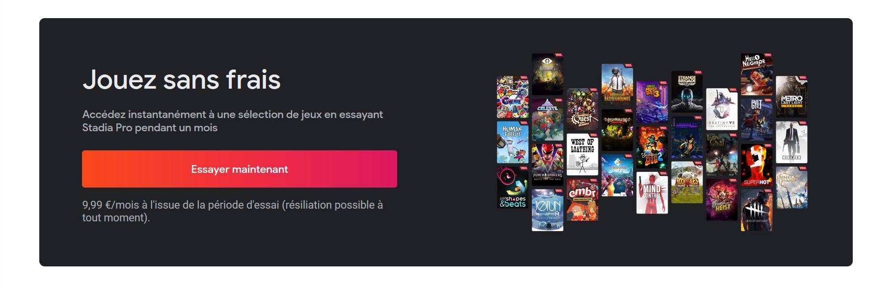- Stadia Pro : Pour 9,99 € par mois, vous profitez d’un accès au service avec une définition jusqu’à 4K HDR 60 FPS et avec un son 5.1 surround. Avec cette offre proche de celle du Playstation plus, vous bénéficiez régulièrement de jeux gratuits. Cependant il faudra quand même acheter les jeux auxquels vous voulez jouer.