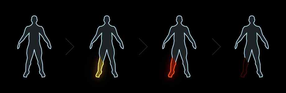 Bien que certaines blessures ne guériront pas complètement tant que le joueur n’aura pas reçu le bon niveau de traitement, les installations médicales les plus élémentaires seront en mesure de maintenir en vie les joueurs blessés non-mortellement et d’arrêter les hémorragies.