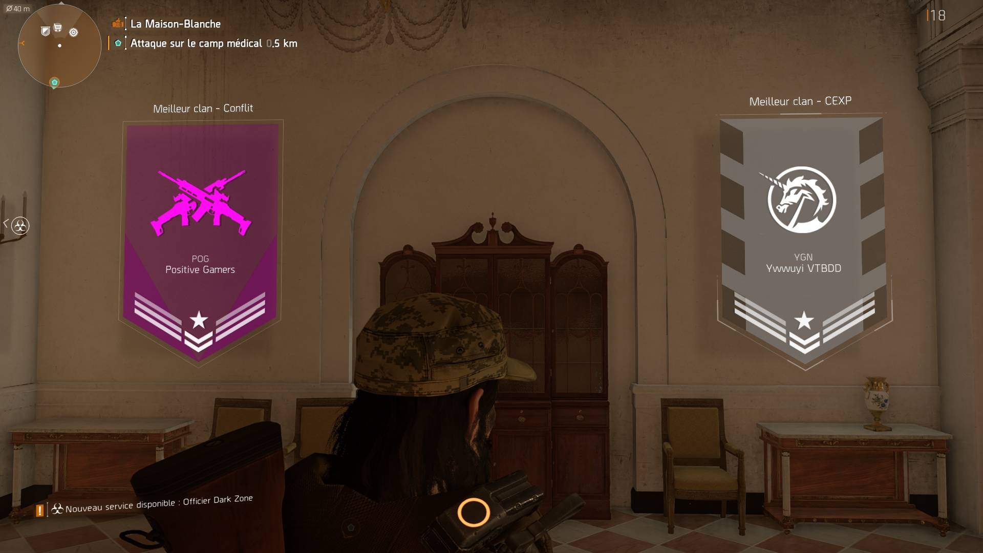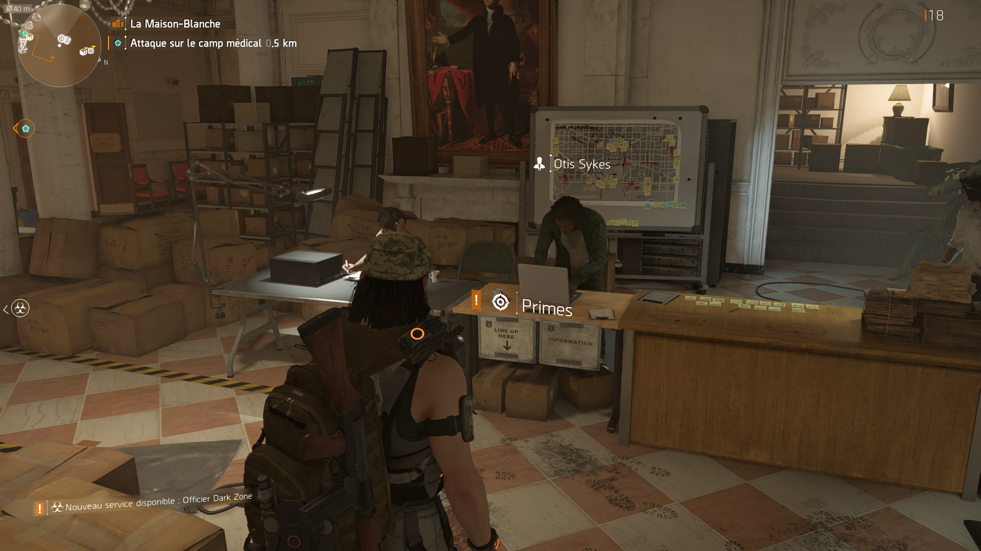 Après le sous-sol, montons à l’étage. Devant vous, vous verrez un PNJ qui propose des missions « primes », à droite de celui-ci un stand pour les missions « projets », dans la pièce à côté, la cantine, puis changez encore de pièce, vous apercevrez l’infirmerie, et pour finir, toujours dans une autre pièce vous trouverez le centre névralgique des opérations, où tout se passe. Juste à côté se trouve l’officier Senait Ezera, ce PNJ se charge de tout ce qui concerne la Dark Zone.