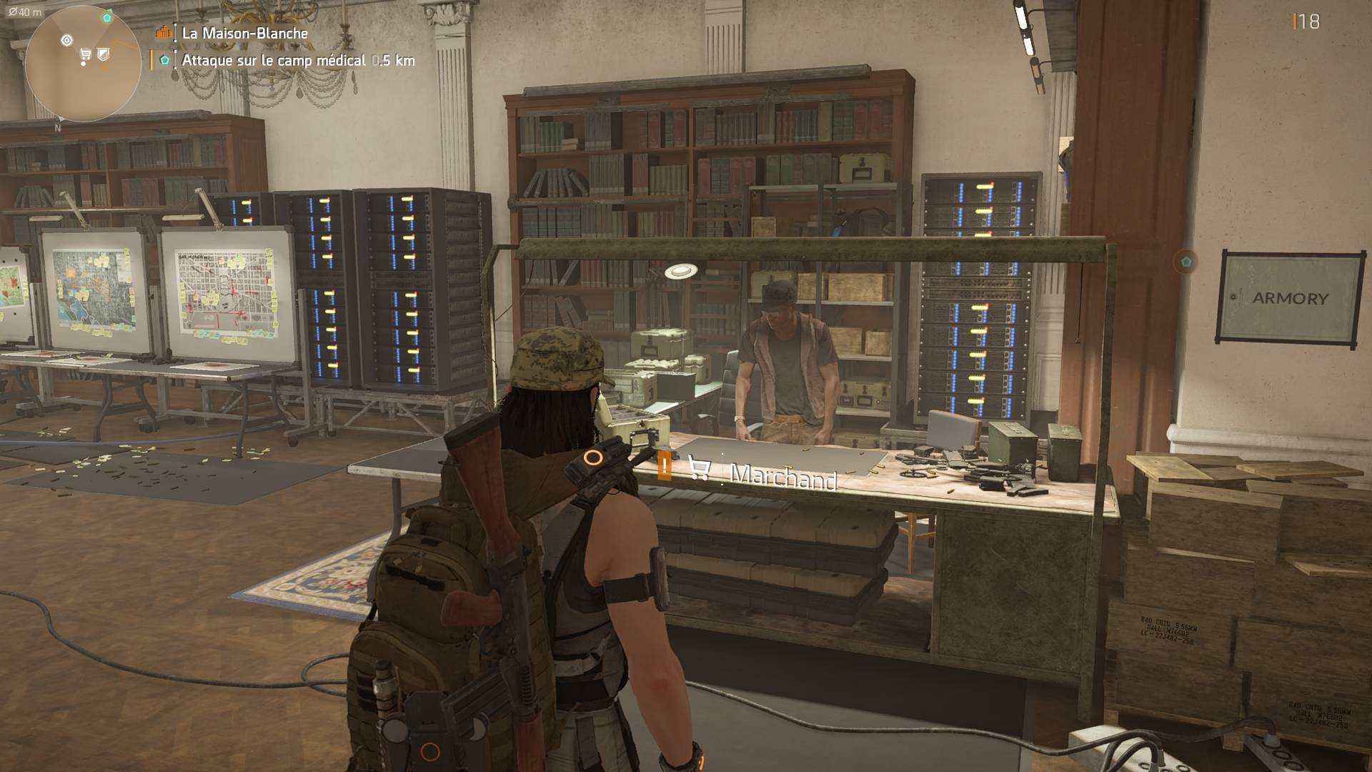 Maintenant retournons à l’entrée de la base, où se trouve l’intendant. Cependant, au lieu de prendre à droite, cette fois-ci nous allons prendre à gauche. Vous trouverez le poste de fabrication tenu par Inaya Al-Khaliq. Juste à côté de celle-ci figurera le poste de réétalonnage tenu par Emma Richards, et un peu plus loin vous découvrirez le célèbre bureau ovale. N’hésitez pas à lire notre article pour tout ce qui concerne le craft.