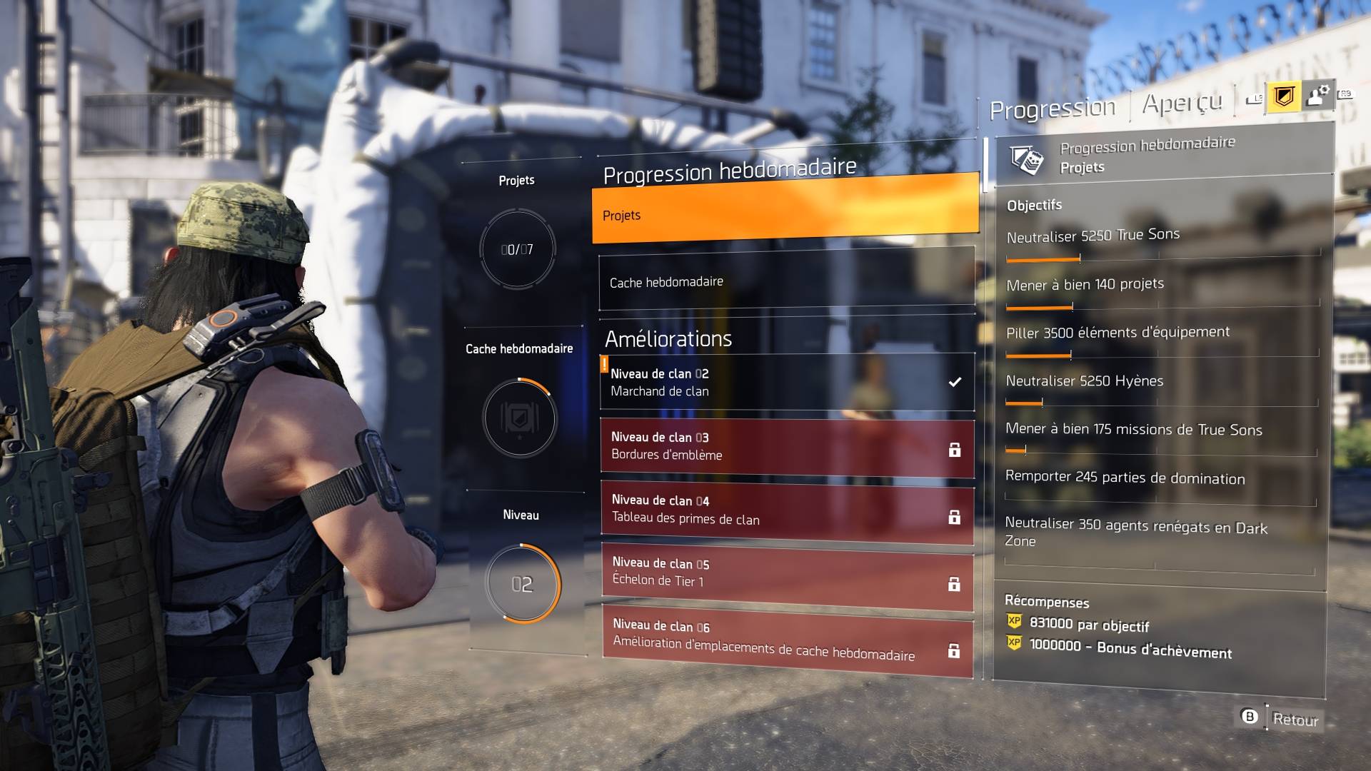 Quand vous ouvrez le menu du jeu, il y a différents onglets, la progression, le personnage, les paramètres etc… Sur l’onglet de gauche, vous trouverez le menu pour accéder au clan. Mais avant toute chose, il vous faudra débloquer un PNJ du nom de Grace Larson, qui sera recrutée après avoir fini la mission « Musée Viewpoint ». C’est une mission principale qui se situe à l’est du quartier Fédéral Triangle.