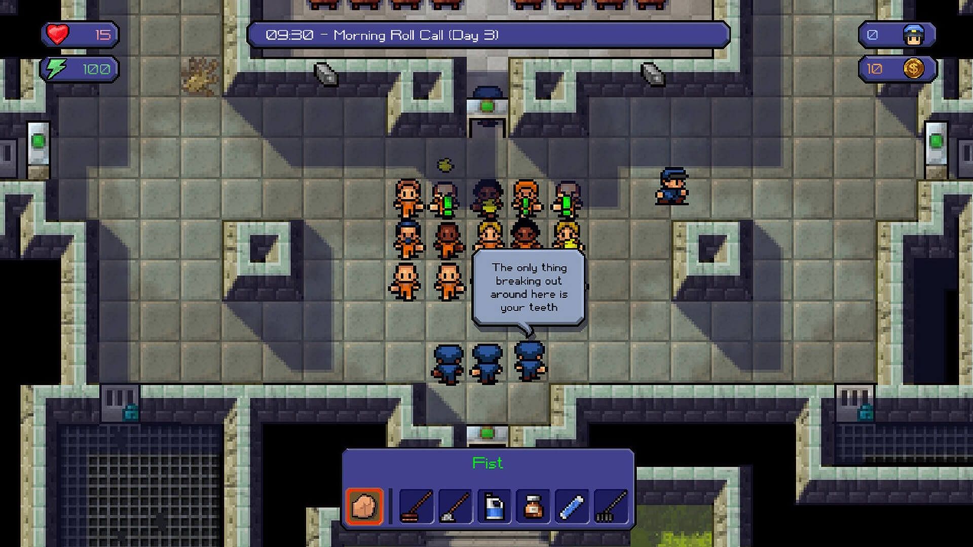 Et voici le pitch du jeu : vous allez devoir planifier votre évasion via tous les moyens. La manière importe peu, du moment que vous arrivez à vos fins. Car avec The Escapists, vous avez tout un panel de possibilités pour retrouver votre liberté : creuser un tunnel sous la prison, organiser un émeute, ou encore revêtir l’uniforme d’un gardien pour sortir par la grande porte.